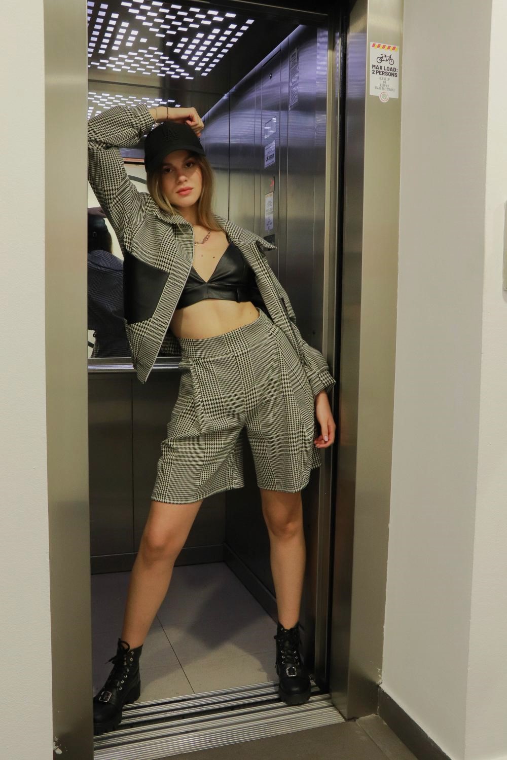 Compleu format din bomber jacket și pantaloni scurți din stofă în carouri.