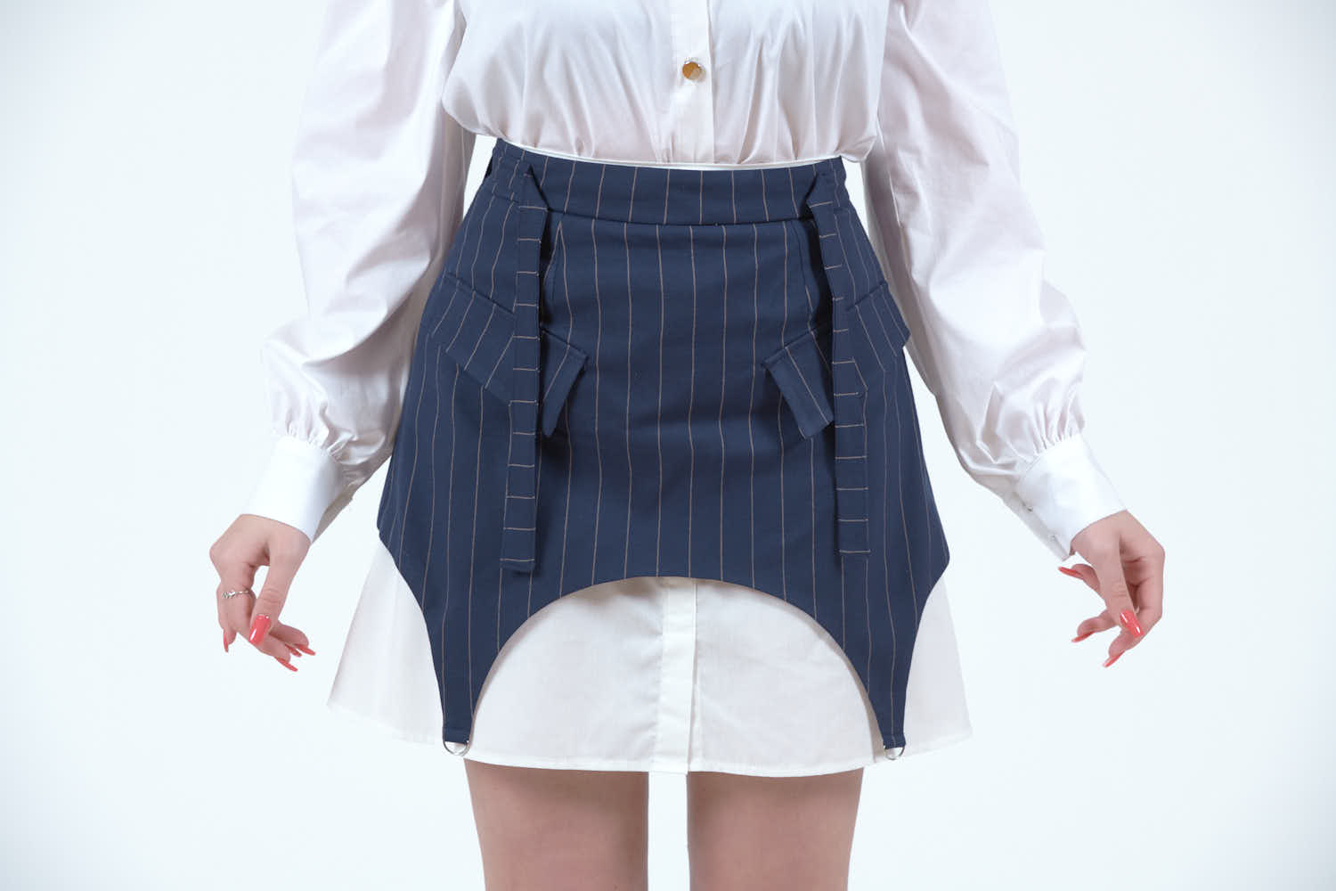 Fustă mini bleumarin cu dungi fine verticale, confecționată din stofă cu structură ușor elastică. Modelul are o croială specială cu tăietură curbată în față și detalii decorative precum buzunare aplicate și bride cu inele metalice. Se închide cu fermoar la spate și poate fi purtată atât peste cămăși, cât și ca piesă statement în ținute casual sau smart-casual.