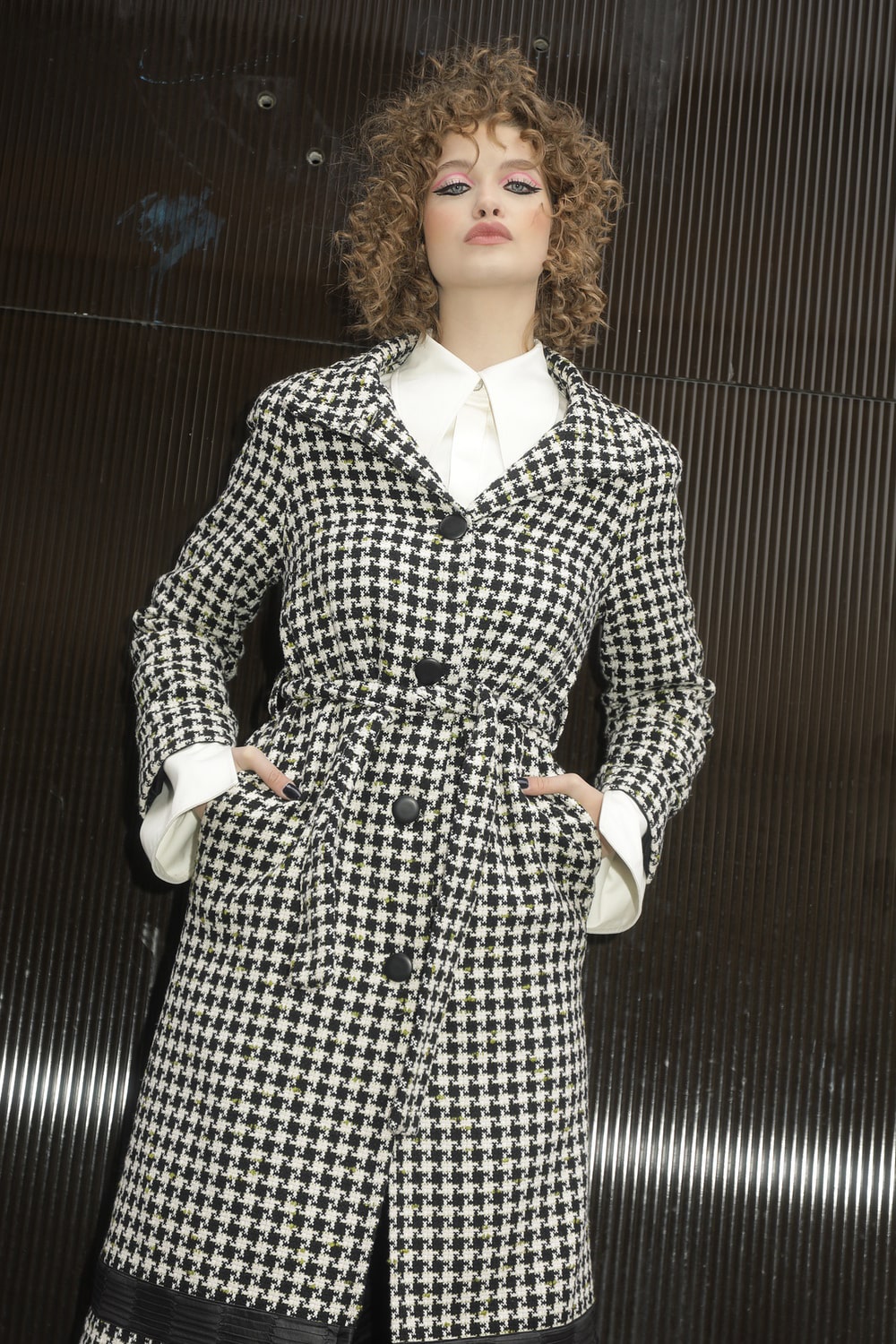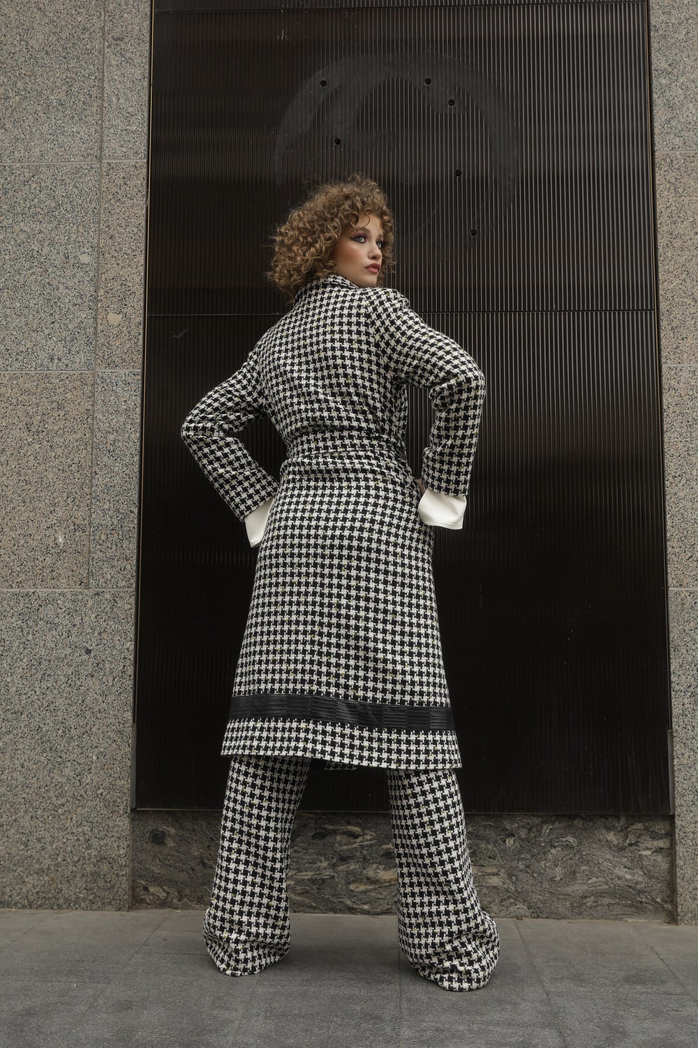 Paltonul are un croi lejer, din stofa tip Chanel în carouri alb-negru!