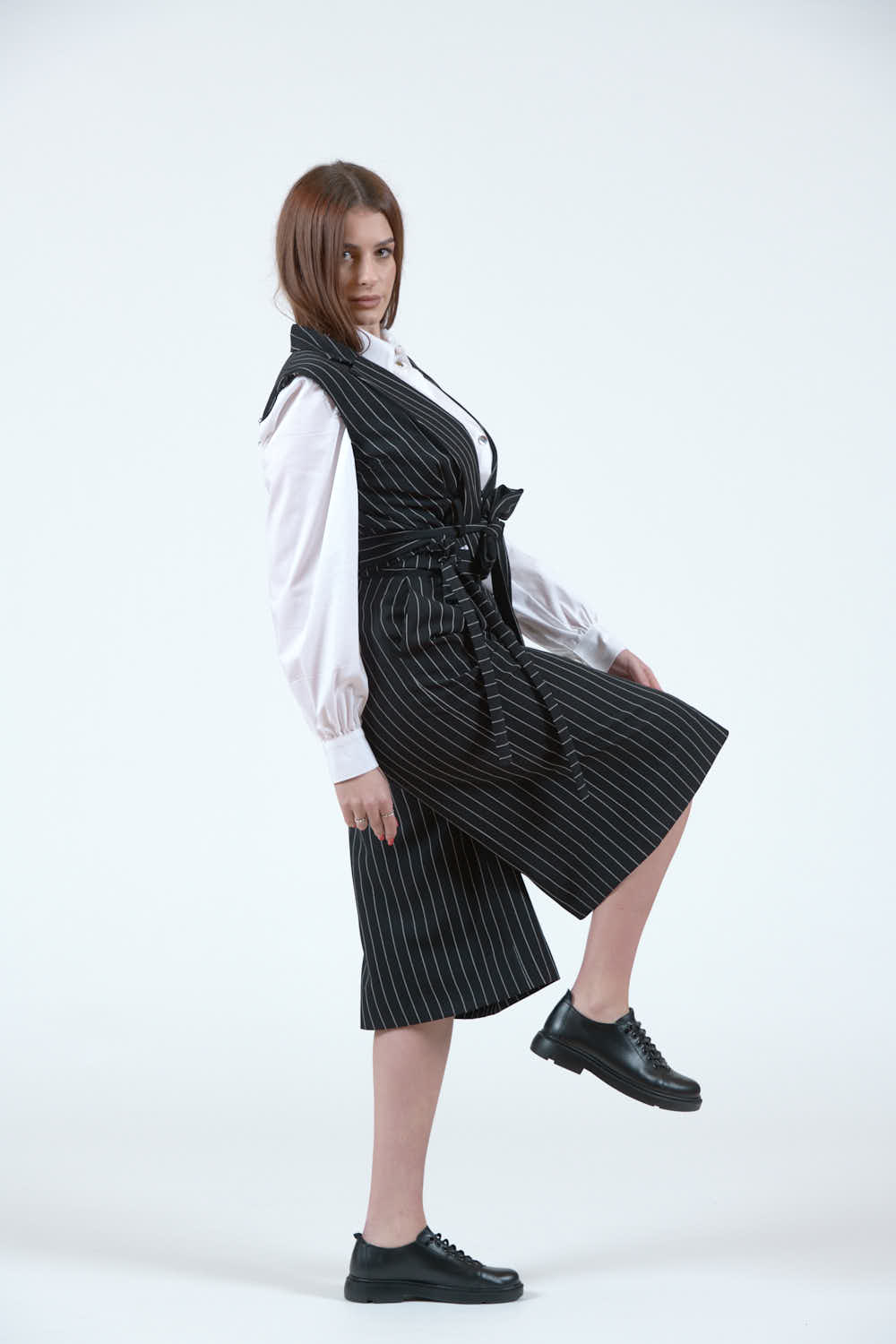 Pantaloni 3/4 din stofă neagră cu dungi albe verticale. Model cu croială largă și talie înaltă, prevăzut cu șnururi reglabile în talie pentru ajustare. Lungimea ajunge până la gambă, oferind un look modern și lejer. Se închid cu fermoar la spate.