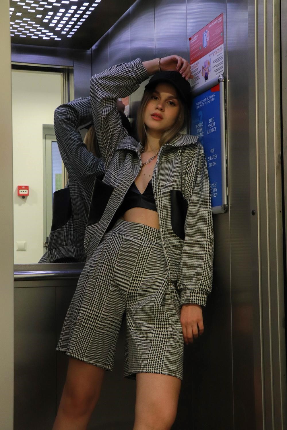 Pantaloni scurți din stofă în carouri alb-negru, cu buzunare laterale și cute inserate pe față.