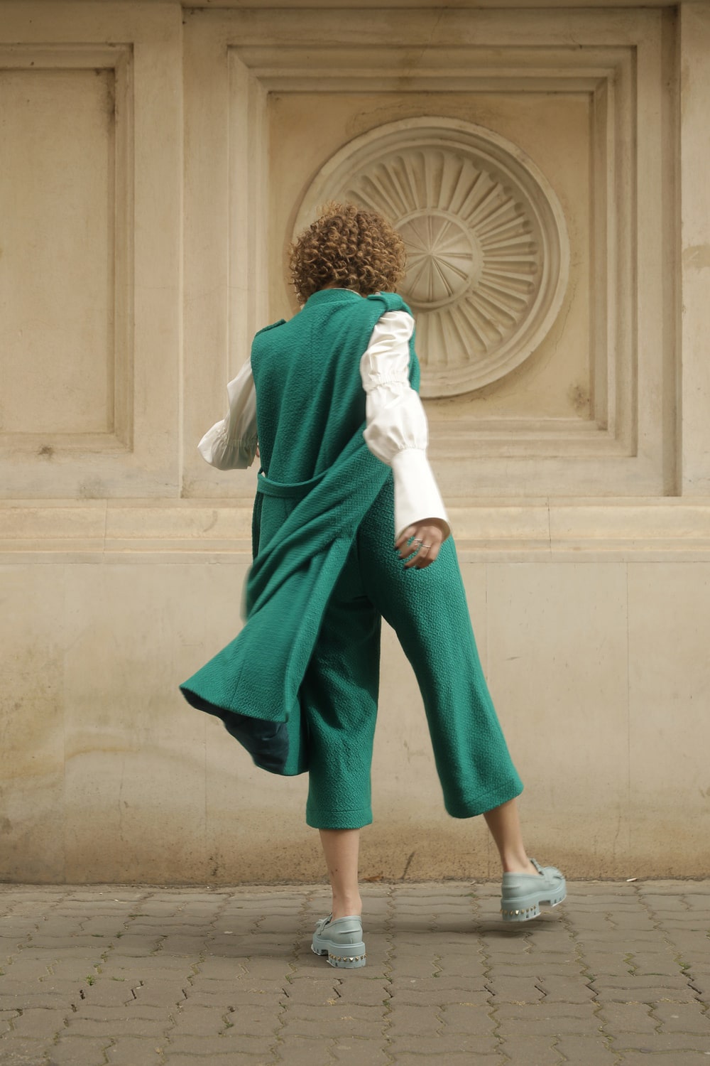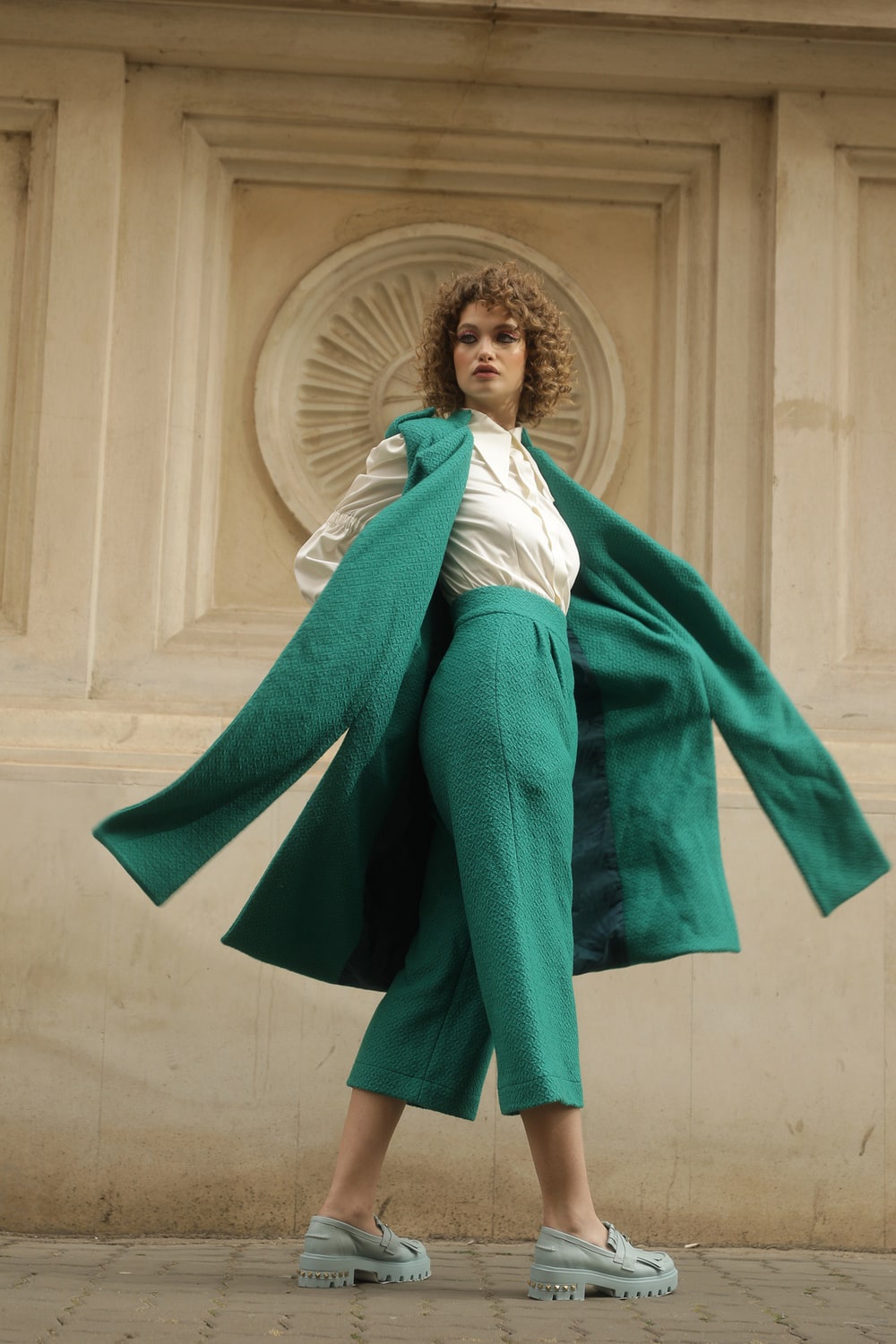 Pantalonul de lungime 3/4, culoare verde turquoise, din stofa bucle, are croi lejer, evazat, cute in laterala pe mijloc fata!