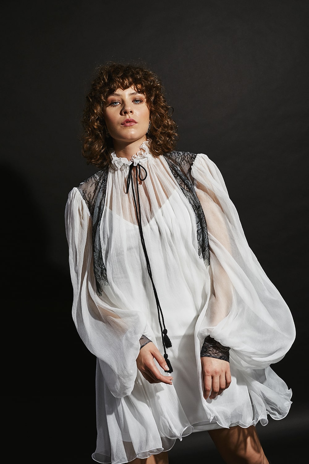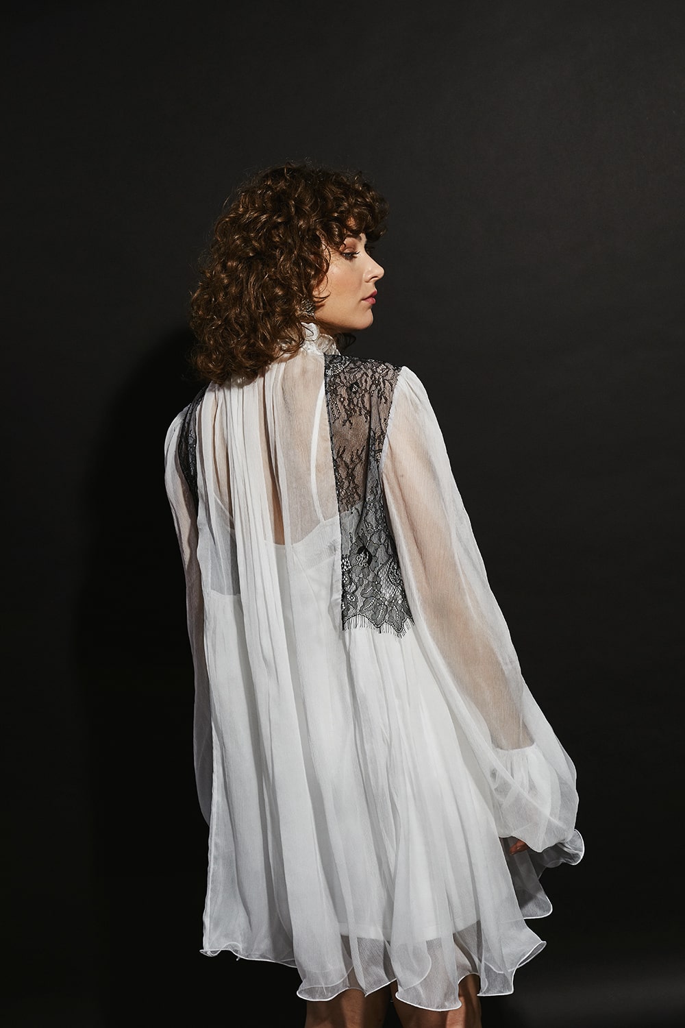 Rochie din muselina de matase, tip ie, cu detalii din dantela chantilly neagra.