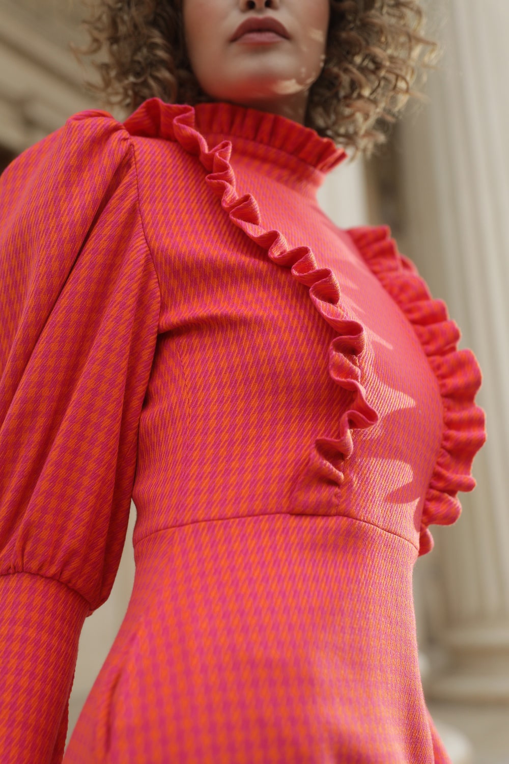 Rochie din bumbac, in carouri de culoare portocaliu cu ciclam, cu bust atent marcat de volanase ce ofera o nota piele rebela.