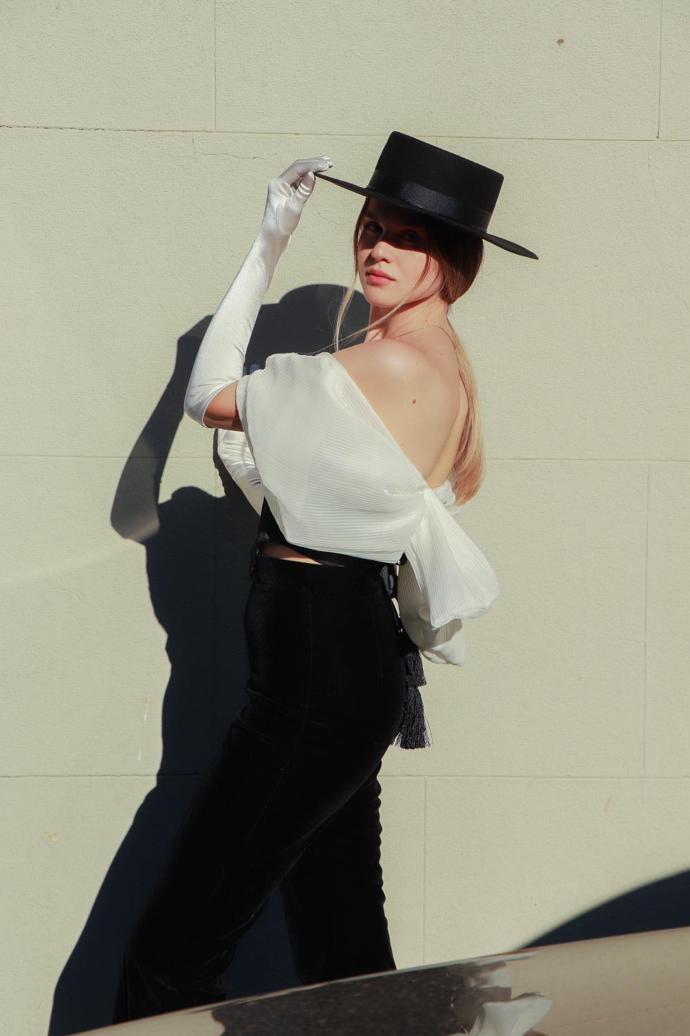 Corset scurt din brocard negru, cu detalii în volum pe umeri realizate din organza plisată ivoire.