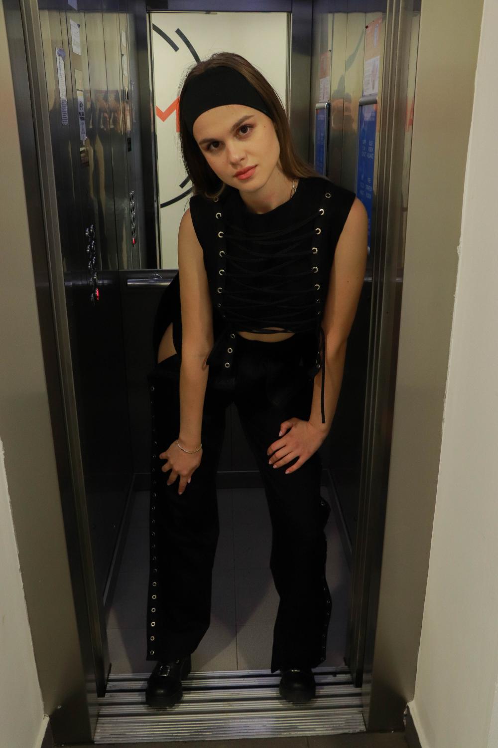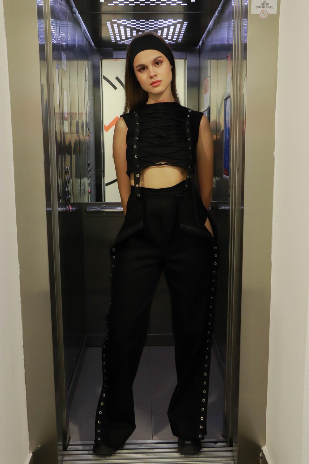 Top din denim negru, scurt, cu tăietură asimetrică pe bust și detalii din ocheți și șnur pe față.