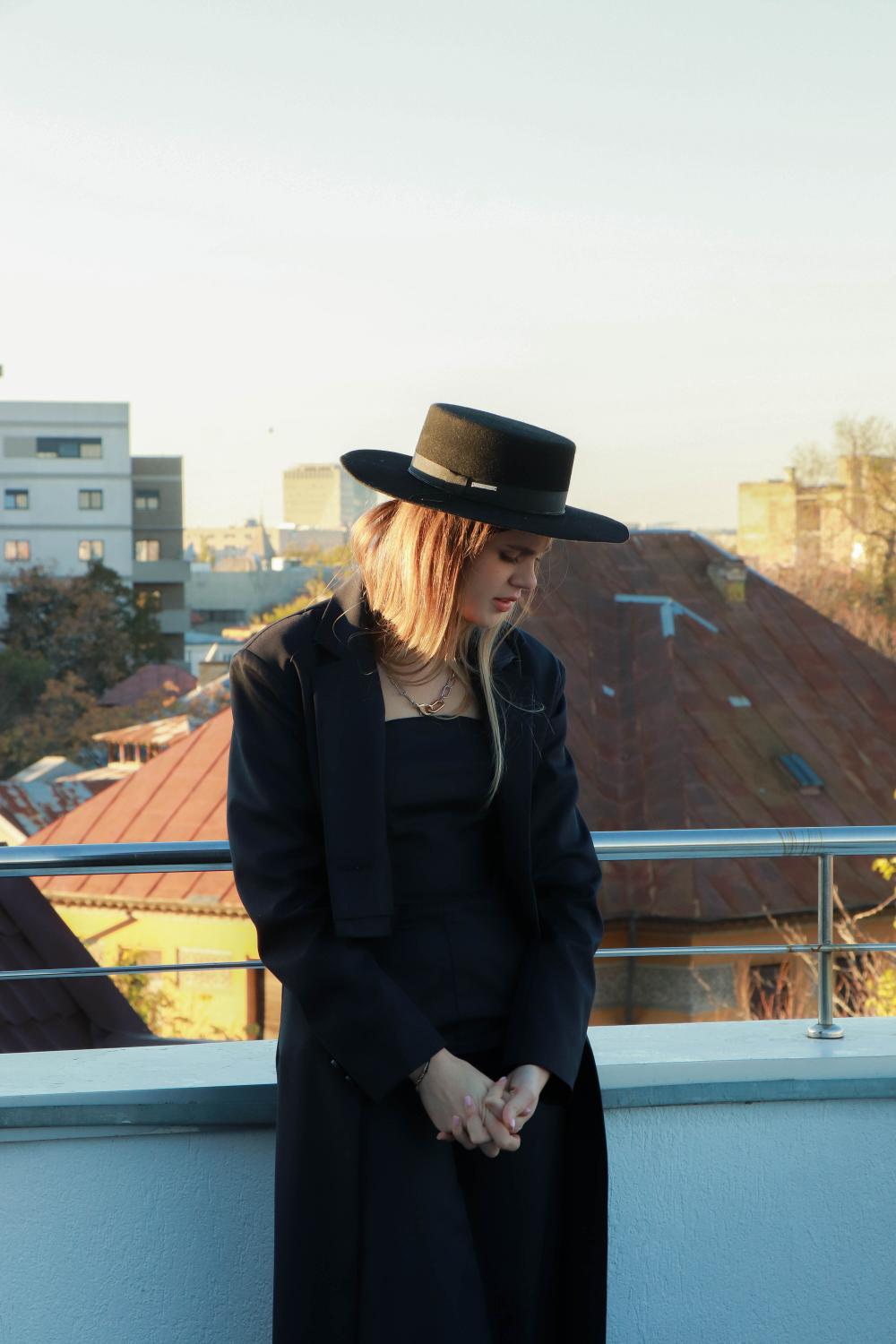 Top stofă din cașmir și lână bleumarin, cu un design inovativ, redat de croiul cu spatele gol, reglabil, ajutat de o prindere cu anouri și șnur continuat în partea de jos cu panouri simetrice pe laterale.
