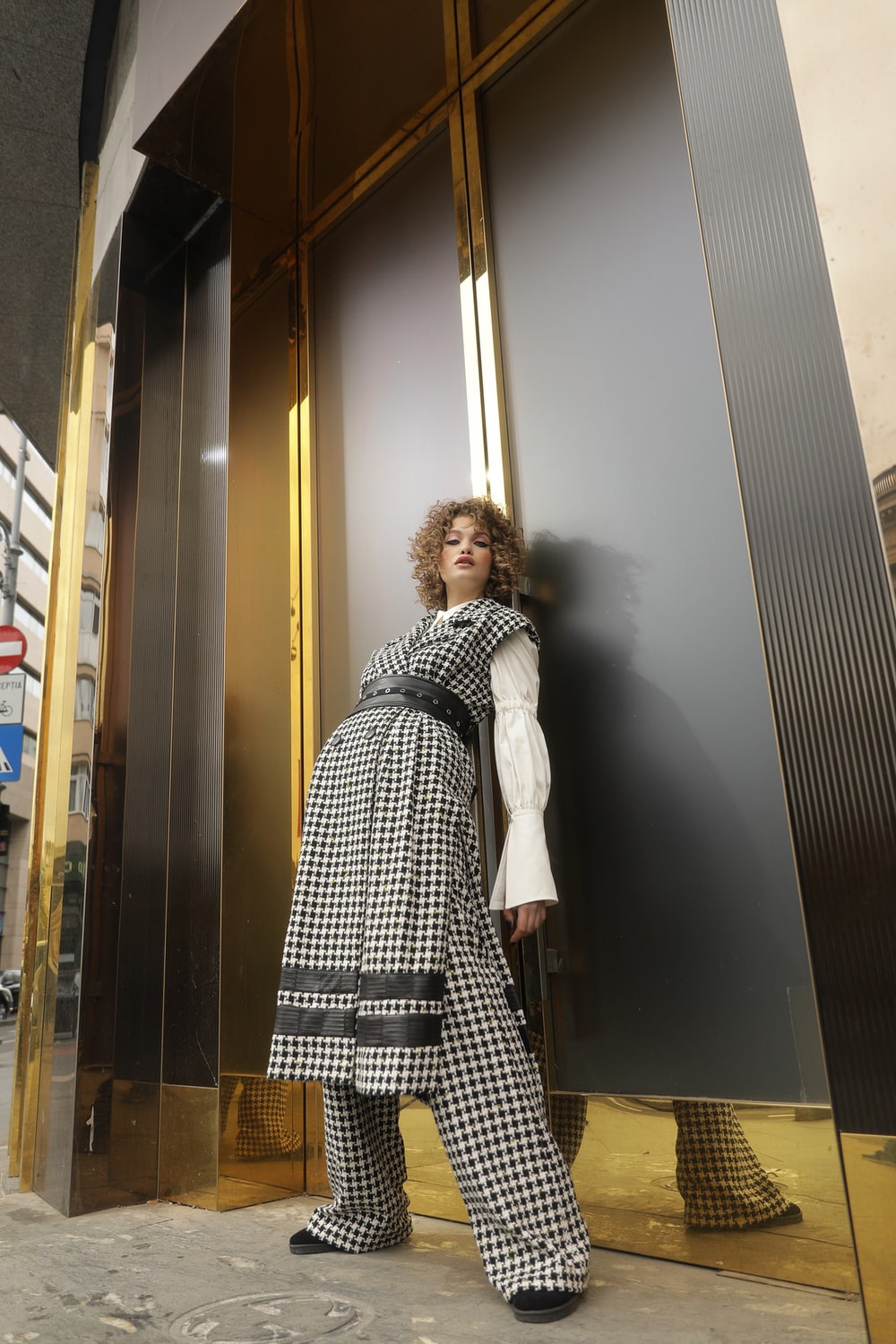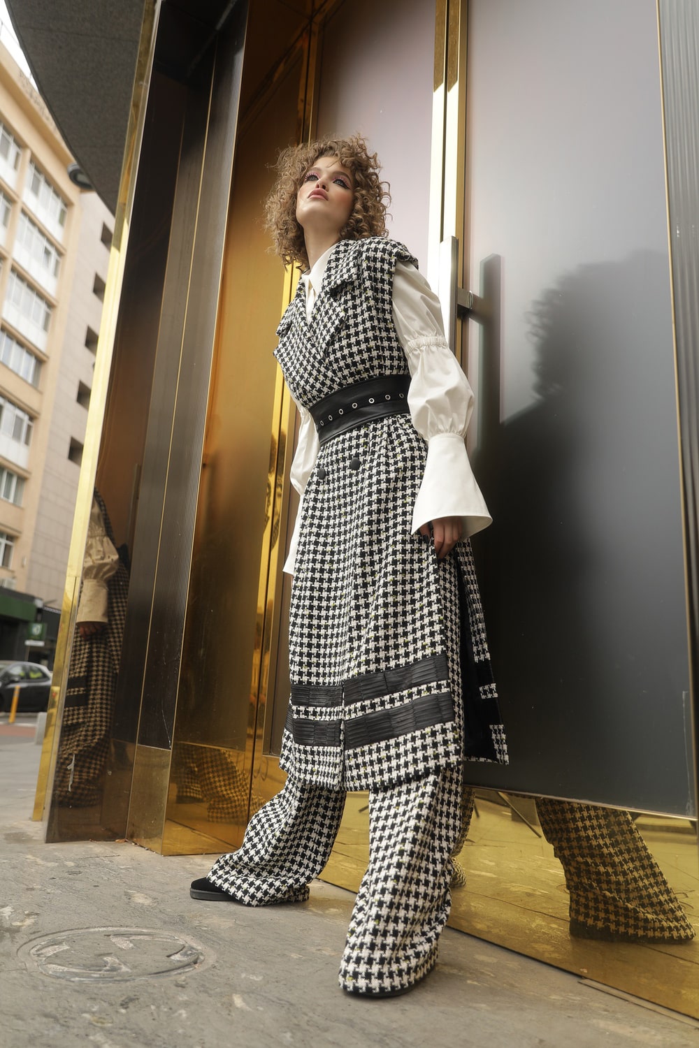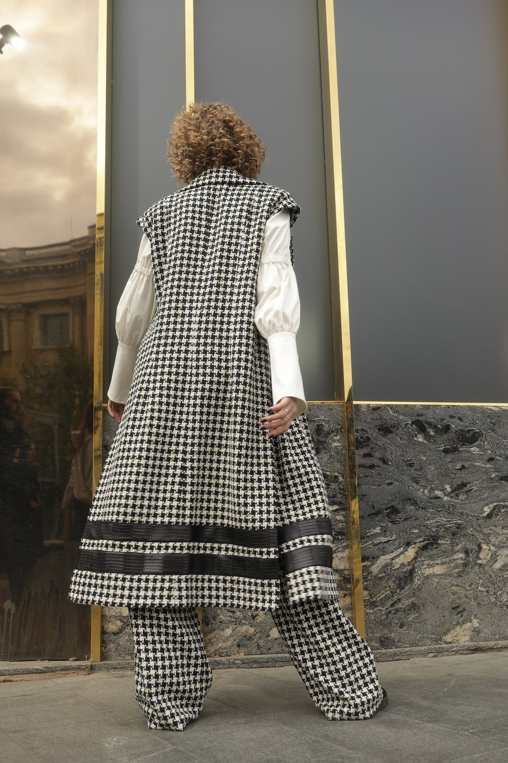 Vesta din stofa tip Chanel, in carouri de culoare alb - negru. Croiul prezentat este unul lejer,oversized,  cu umăr ușor căzut si cordon detasabil pe talie.